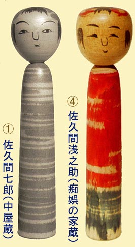 その後、同描彩でやや形態の異なる別タイプのものも見つかったが、この別タイプの加藤文成蔵品、中屋惣舜蔵品は鹿間時夫によって「こけし手帖五十五号」(のち「こけし鑑賞」に転載)で佐久間浅之助として紹介された。この中で鹿間は米浪蔵品について「浅之助と喝破したのは土橋氏であるが、その頃誰いうとなく、そのような風潮になるから妙であった」と書いて、浅之助説には明確な論拠がはじめからないままいつの間にか定説になったというニュアンスを述べている。よくよく振り返ってみると、実証学的な考察はあまりなく大勢の期待と渇望からいつのまにか浅之助になったという側面がある。