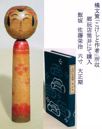 とあって、これが橘文策の本格的なこけし蒐集のきっかけとなった。このこけしは飯坂の佐藤栄治(慶応元年〜昭和三年)作で、「こけしと作者」九ページの群像写真中にある。