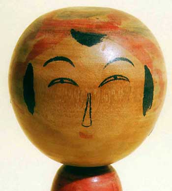 この形態の栄治のこけしは、深沢コレクション、天理参考館等にもある。いづれも三日月眼に撥鼻、紅の口、胴には四辨の花を描く。ただ顔の表情の異様な迫力はこのこけし独自のものであり、橘さんが永く愛着を懐いていたのも頷ける。