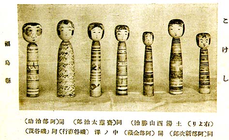 ここに掲げた図版は「日本郷土玩具東の部」一二七頁の福島県のこけし紹介であるが、武井武雄は次のように解説している。「ここには五人の作者があり各々異なった特質を見せているが、由緒古い土湯系として共通の特色は頭の蛇の目様式と胴の轆轤描きの横縞とにある。最も異色あるものは斎藤太治郎の支那人形らしいフレッシュな美しさと、阿部治助の化けて出そうな薄汚い怪奇魅力と、阿部金蔵の華やかな可憐さとであろう。一体にこの系統は細長いのが通例であって概ね小ぶりのものが多いが、金蔵の二寸級の豆こけしなどは、眼の中に入れても、という程可愛い出来である。」写真右より三本目は「こけし這子の話」を踏襲して阿部治助としてあるが、じつは渡辺作蔵作であることが後に判明した(這子の話の写真図版では治助を金蔵名義で、作蔵を治助名義で掲載していた)。阿部治助は閑話(1)で紹介したように全く別種の情味ある渋いこけしを作った。ところで武井武雄のこの解説で得をしたのは斎藤太治郎と阿部金蔵、損をしたのは阿部治助であった。治助は「化けて出そうな薄汚いこけし」という渡辺作蔵のこけしの評価を自分のものとして引きずって、土湯一下手な作者と言われながら不遇な一生を送った。