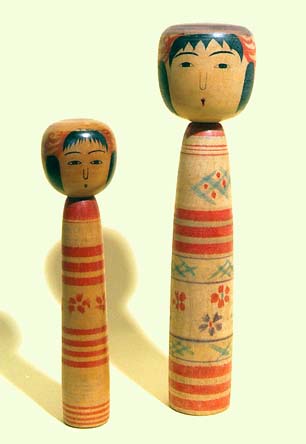 土湯 阿部金蔵」と墨書がある。「図譜」の九寸とは轆轤線の数が違っている(下段の赤線が図譜は三本)。さてこれが金蔵か広史か、昭和八年の広史九寸二分とこの昭和四年の金蔵七寸を並べてみよう。写真の右が広史名義のこけし。