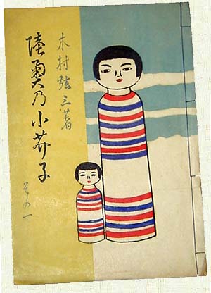 「陸奥の小芥子」は昭和十年三月に弘前の木村弦三著作発行になる七十部限定非売、和紙紙装和綴の褐色インク謄写版刷の私家版である。発行部数が少なく、今では稀覯本の一つで、左は都築祐介氏の所蔵本を写させて戴いた。装幀図版は全て板愈良(いたまさよし)の手になり、表紙は佐藤伊太郎大小二本の版画、扉絵は川越謙作、図版三枚に盛秀太郎、斎藤幸兵衛、山谷多兵衛、川越謙作、小松五平、長谷川辰雄、三上文蔵七名の作者作品が紹介されている。このうち、幸兵衛、多兵衛、謙作、伊太郎、辰雄,文蔵はこの「陸奥の小芥子」で初めて世に知られることになる。