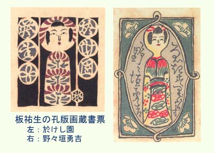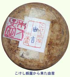 蒐集家からこけしを割愛していただいたときに、前の所蔵者の蔵票がついている場合がある。「これははがさずに大切にそのままにするのがよい、自分の蔵票を貼る場合は少し重ねて上に貼っていくものだ」と教えられた。写真に示したように「こけし娯屋」に重ねて「木人子室」を貼るといったやり方だ。蒐集は伝来を大切にする、したがってどのような所蔵者を経て現所蔵者に伝えられたかも、その価値のひとつなのだと聞かされた。