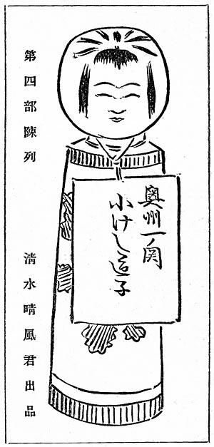 清水晴風はこの第四部に前述の磐城浪江町小けしおぼこ、奥州一の關こけしおぼこ他大量の郷土玩具類を出品している。なおこのときの奥州一の關こけしおぼこは同文館版の挿絵(右図)にある通りあまり似ていないが大沼甚四郎である。もう一本は閑話(23)で紹介した浪江産であった。