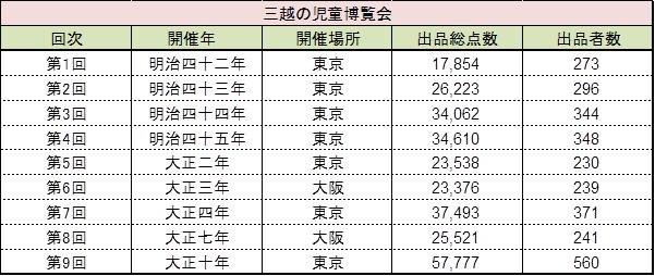 三越の「児童博覧会」は九回開催された。七回が東京日本橋で、二回が大阪三越での開催であった。規模の変遷は下表のとおりである。