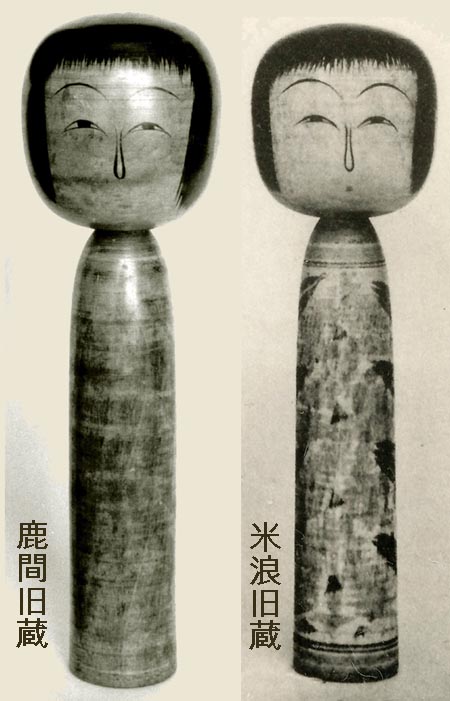 右下図は鹿間旧蔵と米浪旧蔵の源吉であるが、川崎巨泉のものに近い時期の作であろう。鹿間旧蔵は西田静波亀楽堂が旧蔵していたもの、鹿間氏は戦後の梅田書房売立会で入手している。やはり、関西から出たこけしであった。大正十四年に毎日新聞社主催の大大阪記念博覧会には川崎巨泉とならんで西田静波も出品しており、彼らは同じ玩具仲間で「娯美会」の会員でもあった。この玩具仲間が大丸で同じ時期に入手したのかもしれない。米浪氏と川崎巨泉の親交はおもちゃ絵に描かれた注記からも伺える。ただ米浪氏の蒐集は昭和に入ってであるから、米浪氏の源吉は大正期に大丸の物産店で求めた人から譲られたものであろうか。(川崎巨泉のこの源吉図は検索のページから「画題キーワード」に「山形県物産展」を入れて検索すれば見ることが出来る、万之丞は「大鰐」で検索すればよい。)