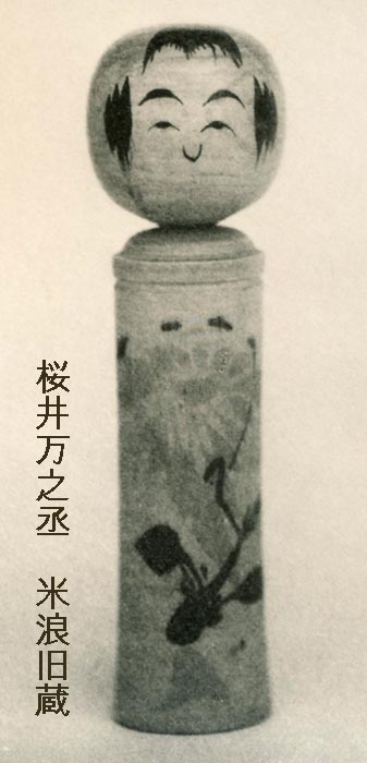 鳴子のこけしが当初大鰐産として描かれていて、実は桜井万之丞と注記のあるものもある。おそらくこれも米浪氏の教示であろう。左上図は米浪旧蔵の桜井万之丞であるが、川崎巨泉の大鰐産とされたものと全く同種の作である。巨泉の絵の別の鳴子小寸物にも「大正十年ころ大鰐産と云ひ入手せしもの 鳴子町湯元桜井万之丞作と云ふ」との注記がある。米浪旧蔵も含めこの一連の万之丞は大正十年ころ関西地方で売られたものであることが推測される。