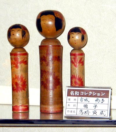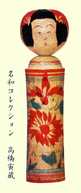 名和コレクションにはカスミ会時代に、渡辺鴻のものや、吾八、東京こけし友の会の幹事経由で多くの古品が集まった。コレクションのこけしは、後にそれぞれの産地、あるいは県の然るべき場所に寄贈されていると聞く。ここに載せた高橋寅蔵のこけしは渡辺鴻の旧蔵品、雑誌「鴻」、「古計志加々美」、「こけしの美」などに掲載された。雑誌「鴻」には二十年ほど前のものと紹介されているから、大正期の作と言うことになる。今は鳴子の日本こけし館にある(常陳ではない)。