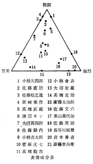 「こけし辞典」ではさらに表情成分系(格調・甘美・強烈)という新たな三角形の体系も加えた。