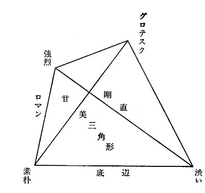 「美と系譜」出版の翌昭和四十二年に出版された「こけし鑑賞」では、これをさらに進化させ、技巧・ロマンを稜上に、甘美を面に変更して表情四面体という「情味」の分類体系を構築した。「こけし鑑賞」は、この体系に沿ってこけし図版を並べ、鑑賞解説を付した。ここに掲げた四面体は、最終的に「こけし辞典」の「情味」の項目に掲載されたもの。