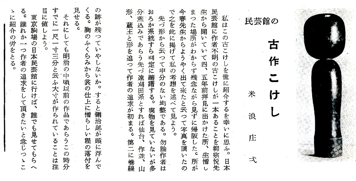 民藝館の黒こけしは「こけし手帖・6」(昭和30年)に米浪さんによって既に紹介されている。ただ米浪さんが実物を見たわけではなく、柳宗悦さんから写真を送ってもらっただけのようだ。