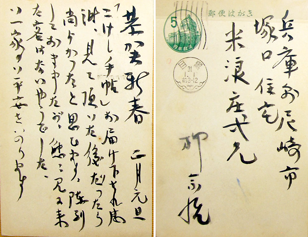 『恭賀新春 正月元旦 「こけし手帖」お届けくだされ感謝、見ていただいた後だったら尚よかったと思ひます。 陳列しておきましたが態々見に来た客はないやうでした。ご一家のご平安をいのります』