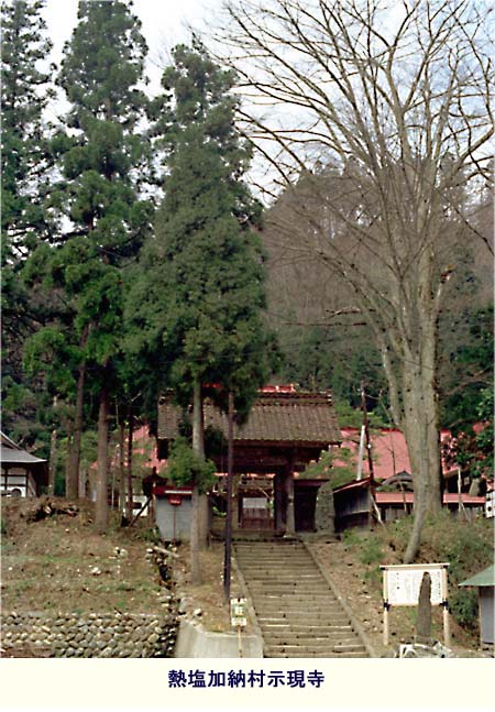 熱塩の温泉街の一番奥に護法山示現寺がある。この寺は、平安初期(大同二年)、前年の磐梯山の噴火を鎮める為に五峰山慈眼寺として僧空海が建立したもの。もともとは真言宗の寺であったが、長い間に荒れ果てしまったらしい。今から約六百年前、栃木県那須の殺生石を鎮めたことで知られる源翁禅師は奥州で曹洞宗を広めていたが、その拠点として護法山示現寺として再興したと伝えられる。奥州各地に三十七ケ寺の末寺を有する総本山。