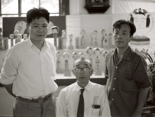 川連の平四郎さんのお宅にお邪魔すると、平四郎さんは、まだ満足せず試作、また試作という状態だった。西田さんの米吉、これは深沢要が昭和十五年十二月に旭川に訪問して作ってもらった二本のうちの一つ、その時の聞書きが「こけしの追求」に載っている、この西田さんの米吉が、私が行った時まだ平四郎さんの手許に有った。そして自分が、日々製作したものと比べ続けているのだった。(右下の写真の白黒の方、右側は西田蔵米吉の現物、左は平四郎さんの復元、左のカラー写真は平四郎さんの習作時期、一本に三方向から目鼻を描いて原物に近づこうと努力していた)