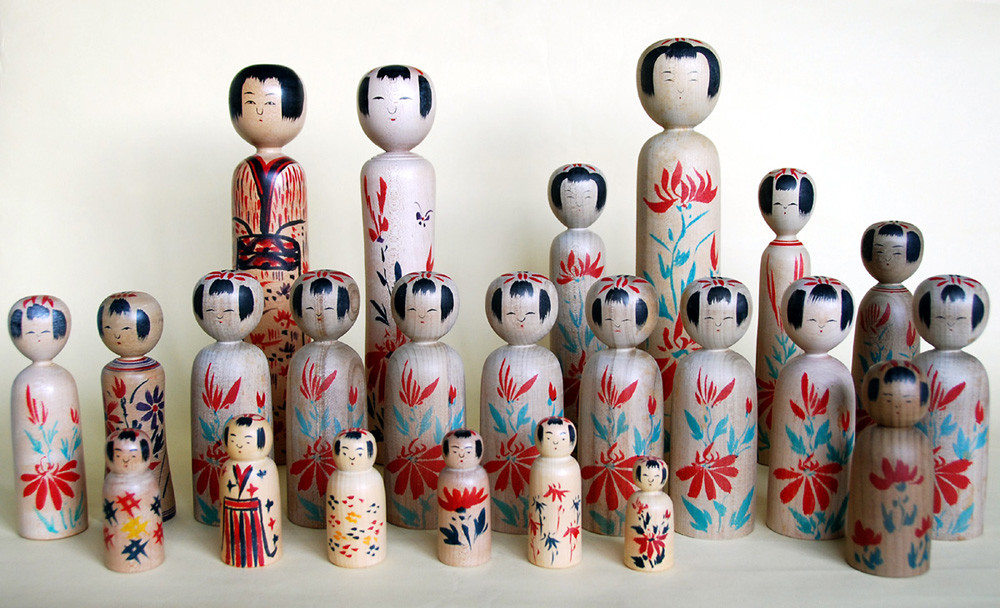 それらは鳴子の古いものにおそらく祖型があり、始原的なところで共通のものを持っていたのだろう。それ故、惣七によってヒントを得たとはいえ、その共通の祖型を押さえているから、違和感のない木地山のこけしになっている。そして、この小寸で胴の太い形態は、その後の平四郎さんや木の実さんの小寸こけしに様々なバリエーションとして現れて、木地山こけしの幅を広げることにもなった(下段群像写真の前列の小寸たち)。
