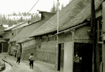 このくじら餅屋も冬季は藁で雪囲いをしている。右の写真はくじら餅屋の前で遊ぶ子供と、孫の子守をする老婆。