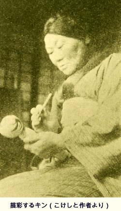 角治が木地を挽き、キンが描彩して、艶と張りのある情味深いこけしを作ったが、これが「鯖湖こけし」として珍重される。