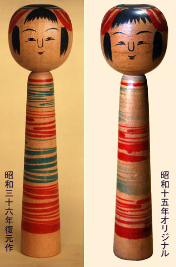 晩年に立て続けに襲った悲劇が浅之助にさらに追い討ちをかける。川俣移転の数ヵ月後、浅之助は馬に蹴られて怪我を負い、それがもとで翌明治三十九年四月二十八日六十歳でこの世を去ることになる。浅之助の死後、やはり菅野の斡旋で明治四十年二男粂松が川俣に来て木管製作を始めるが、一方でまもなく七郎は浪江に去り、米吉は三男常松の死後その妻の後夫となって福島に去ったので、川俣日和田に残ったのは粂松と虎吉のみとなった。この二人は機業用木管製作が中心で長くこけし製作からは遠ざかった。浅之助より早く明治三十年頃に土湯を出て、福島の洋家具店の木地を挽いていた長男の由吉を見出して、最初にこけしを作らせたのは東北大学の中井淳だといわれている。昭和十年頃の復活期の数本が知られている。五男七郎は浪江にいたが、しばしば由吉の家で木地を挽くこともあり、由吉がこけしを復活したのを見て、昭和十二年頃から作り始めた。川俣の虎吉は昭和十三年頃、また米吉と粂松は深沢要の要請で昭和十四、五年頃から再びこけしを作るようになった。こうした佐久間兄弟の復活期のこけしは明治末期に製作をやめて以来の再開であり、一種の冬眠状態からの復活であって、明治期の面影を残すものとして貴重である。ここに紹介するらっここれくしょんの二本は高久田収集品で昭和十五年の作、胴のロクロ線はやや繊細になったが、例えば右の七寸は首元から直線的に胴底に広がるいわゆる三角胴で、虎吉の戦前の良い時代の典型的形態である。このように緊張感のあるこけしを作った虎吉も、戦後になると他の産地の影響を受け、胴は太く膨らんで頭も大きくなり、フォルムは崩れた。面描も目じりが下がり、口は紅のみとなって甘い表情に変わっていった。上掲の初代虎吉の写真とともに写る四本のこけしはこの当時の作に近い。虎吉のこうした落潮に危機感を抱いた福島こけし会は昭和三十五年に戦前作を虎吉に見せて復元を行い、翌三十六年には橋元四郎平氏が旧らっここれくしょんの七寸を川俣に持参してその復元を行った。「昭和三十六年橋元四郎平氏の指導による復元作十本は、大部分橋元氏が手許に残しているため、一般には知られていないが、昭和十五年に肉迫した快作であり、戦後虎吉の代表作となっている。」とこけし辞典は書いた。橋元先生は辞典のこの記述を目にして「自分でさえ忘れていたことを辞典は書いているんだよ。大部分手許に残しているとは恐れ入ったね。まさに辞典恐るべしだ。」と語った。右の二本は橋元氏の昭和十五年作と、昭和三十六年のその復元作である。虎吉はその二年後、昭和三十八年に数え年七十三歳で亡くなった。橋元氏復元の十本には、「川俣 虎吉作 七十才」の署名がある。父の死後二代目虎吉を襲名した長男義雄も、昭和四十四年、当時都立家政にあったこけし店「たつみ」の依頼で昭和十五年頃の父の作を復元した。この一連の復元作も形態描彩ともに、初代の最盛期に迫る良い出来であった。