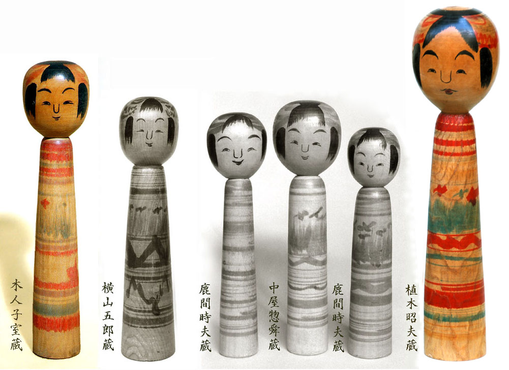 佐久間兄弟の中でも個性があり、復活後もっとも多作であった粂松であるが、その製作期間は昭和十五年から十八年と三年程度で意外なほど短い。昭和十六年以前の作品は、下図左の五本に掲げるように土湯湊屋の正統的な作風で、穏やかなこけしであった。左端は石井眞之助旧蔵で、深沢要経由のものであろう。下図のうち横山・鹿間・中屋の三本は「こけし辞典」の粂松の項に掲載された写真である。右端の植木蔵は昭和十七年に作った瓜実顔の写楽張りと称されるこけしで、個性強烈であり、これを強く支持する蒐集家がいる一方で、敬遠する蒐集家もいる。