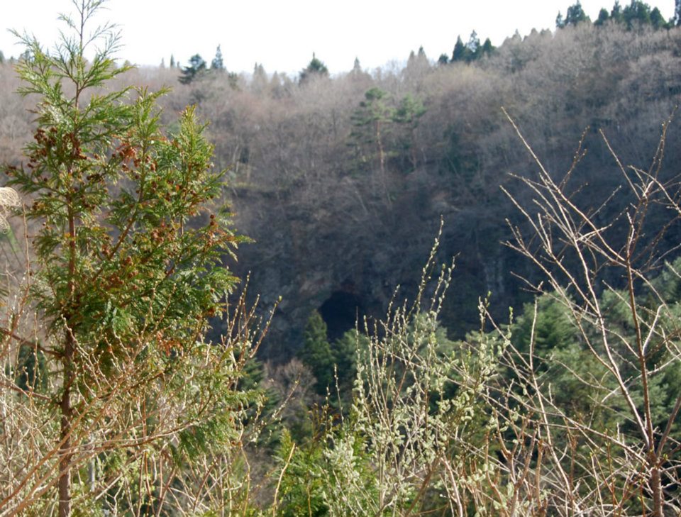 この脇道の突き当りの雑木林の先に高い崖が立ちはだかっており、その中腹に大きな穴が開いている。それが大穴である。まるで山の神の女陰のように見える。