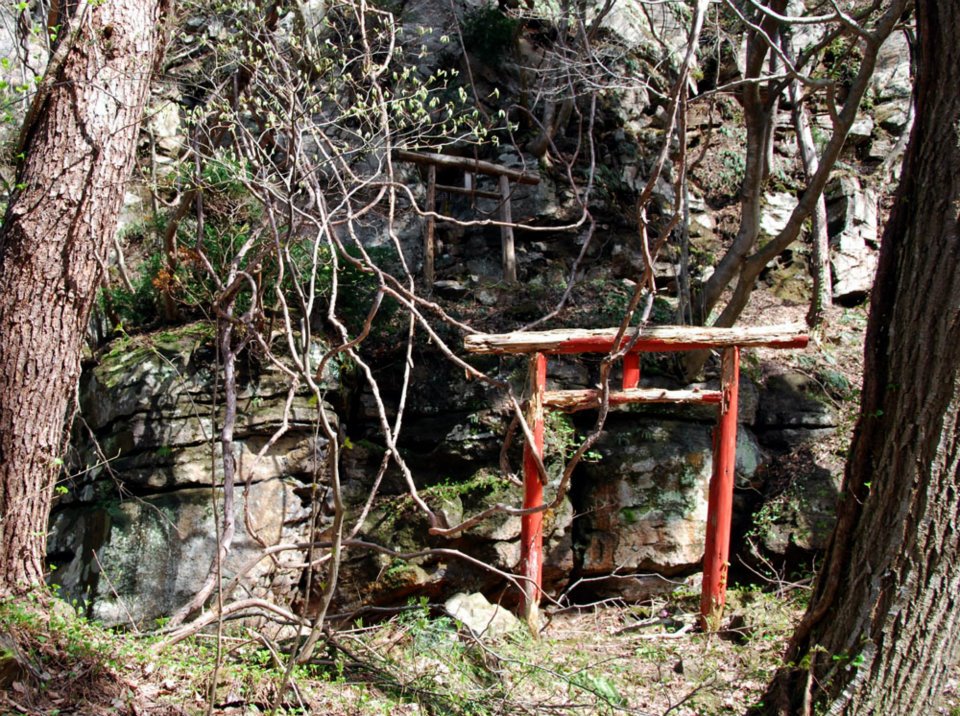 鳴子の大穴とその下の祠入口の鳥居