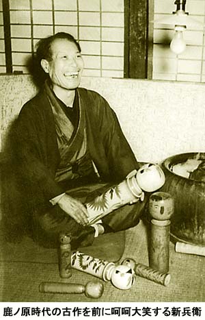 戦後、肘折型として新兵衛が作ったものは、鳴子風の形に目のみ二重、鼻は撥状、胴に重ね菊を書いたものであったが、この鹿ノ原のものとは全く趣の違うものだった。この鹿ノ原を手許に置いてなお作っていた肘折型であるから、それはそれなりにこだわりのある型だったのであろう。