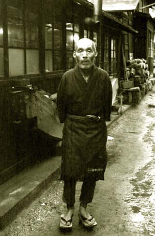 左は昭和三十九年十二月、作業場の前に立つ武蔵。もともと端正で、身だしなみにも気を配る武蔵、この時は「髭も剃ってないから・・」と恥ずかしそうにしながらカメラの前に立ってくれた。