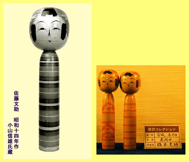 戦前は昭和十二年以降のこけしが知られている。蒐集家の依頼で本格的に作ったのは昭和十四年からであり、掲載の小山蔵品や深沢コレクションはもっとも古い時期のもの。