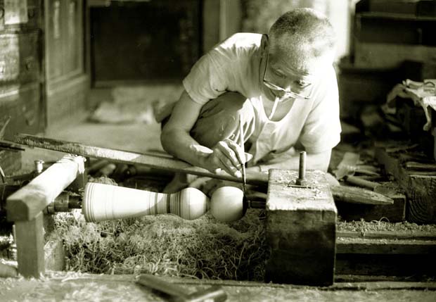 津軽のロクロは床に置くタイプ。タバコをくわえて彩色をする盛秀太郎(昭和四十三年八月)