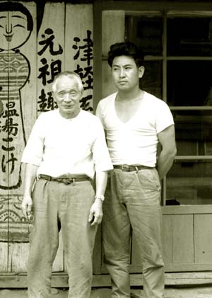 右の写真は、昭和四十三年弟子奥瀬鉄則と盛秀宅の前で写したもの。奥瀬は盛秀の長男真一妻の弟に当たる。盛秀の後継者として人気が高かったが、平成四年五十一歳の若さで亡くなった。