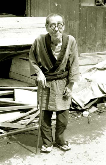 昭和四十三年に私が大鰐を訪れたときには、村井福太郎八十七歳、依然矍鑠として島津木工所の床ロクロに向かっていた。私のために六寸を挽いてくれて、息子の操が描彩をしてくれた。このあと、福太郎は写真にあるように杖をつきながら私を連れて、「津軽の大日様」として知られる大円寺に案内してくれた。