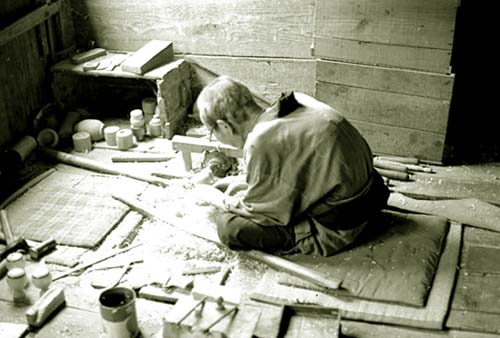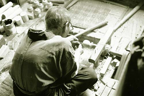 床置きのロクロに向かって仕事をする村井福太郎(昭和四十三年八月)
