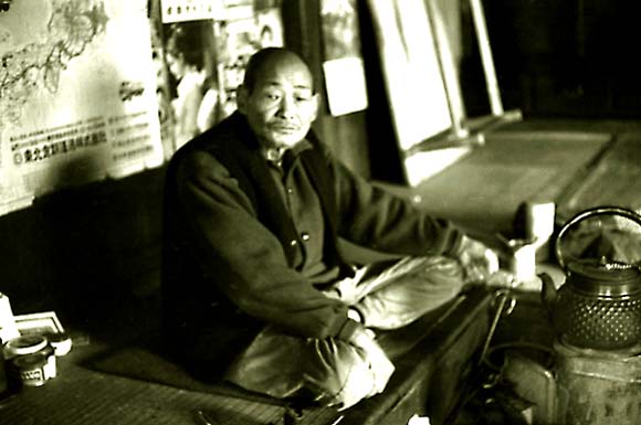 自宅の囲炉裏端にくつろぐ新山久治(昭和四十年三月)