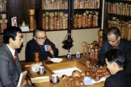 この写真は、東京の久松保夫さんのお宅で吉太郎古作を見入る清次郎さん、その姿に久松さんは湯呑み片手にうれしそうに視線を送っている。