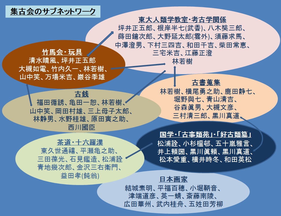 設立者の坪井正五郎の人類学教室のグループとそれにつながる博物学者、坪井と林若樹が関わった竹馬会の玩具の仲間、坪井とその妻女通しての蘭学者、国学者、漢学者のグループ、その国学者で「好古類纂」「古事類苑」の編纂・執筆に加わったグループ、明治期最高の茶人グループ和敬会「十六羅漢」の面々など多彩だ。